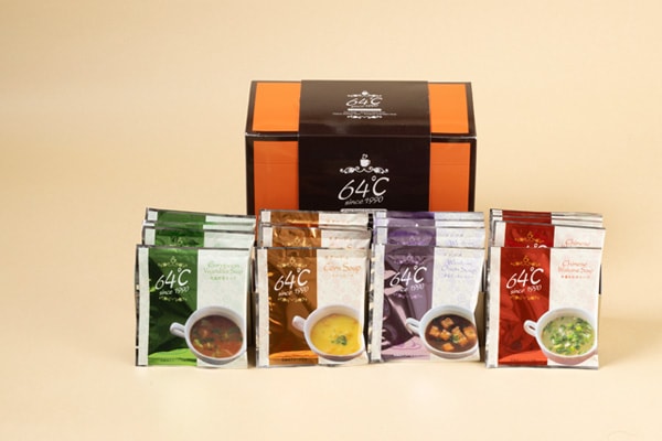 コーンスープ、オニオンスープ、中華スープ、欧風野菜スープ 4種類のスープをセットにしてご提供致しております。64℃とは、スープを美味しく感じられ、 体を温めてる温活にも良いと言われる温度です。