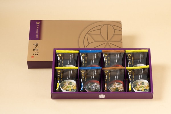 きのこの味噌汁、茄子味噌汁、玉子吸い物の3種類を フリーズドライで手軽に美味しくご提供致します。和の料理人、神田川俊郎さんに監修頂き 現在は神田川本店が監修を引き継いで頂いています。