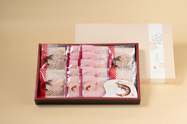 赤えびせんべい、軽い食感のえび松風、海苔の風味のうずまき 3種類のえびせんべいを食べきりサイズの小袋に。赤えびを使用し焼き上げた、ヘルシー志向のノンフライ製法のおせんべい。二度焼き製法で優しい食感に仕上げました。