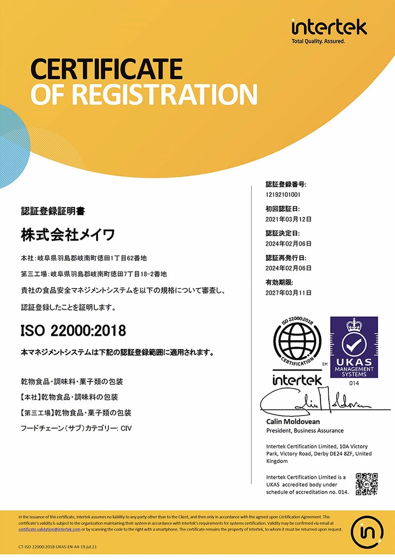 第三者機関による「ISO22000マネジメントシステム」を取得して、お客様に安心をお届けします。